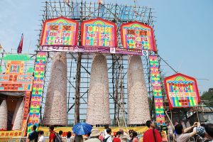 Ils se dressent sans ciller jusqu’aux derniers étages des plus hautes tours, les tiges simplement maintenues entre elles par des sangles de plastique. D’après cet article du e-magazine Loop, cet art ancestral est la méthode numéro une de construction des gratte-ciels, ici. Pour monter un échafaudage de 1000 mètres de haut (ce qui équivaudrait à une tour de 167 étages), il faudrait 5 millions de tiges ! On les utilise pour construire des immeubles, mais aussi pour créer des théâtres temporaires ou des éléments spécifiques comme la tour destinée au festival de Cheung Chau (dont je parlerai ultérieurement sur le blog)!