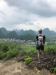 Après avoir pris le bateau depuis Guilin, nous débarquons à Yangshuo. Il est environ 14h. Le soleil tape et la ville sommeille doucement. Nous traversons la ruelle la plus connue : celle des étrangers, nommée ainsi puisque les touristes y arrivent depuis le port. Elle est bordée de dizaine d’échoppes en tout genre. On peut y acheter des habits, du piment, du thé, des fruits frais, des brochettes étranges et j’en passe… mais en début d’après-midi, tout est calme. Armés de notre bagage, nous nous dirigeons vers notre hôtel, situé à 30 minutes de marche du centre, au milieu de la végétation. Dans un premier temps, je ne suis pas convaincue de son emplacement mais dans les jours qui viennent je me rendrai compte de sa précieuse tranquillité et j’adorerai cet Eden si proche de la nature.