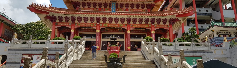 En sortant de la station, on s’est immédiatement dirigés vers un temple, appelé Fung Ying Seen Koon, un temple taoïste situé juste à la sortie du métro. Le temple en question est un centre taoïste fondé en 1929 et je dois avouer que l’endroit est absolument sublime : piliers colorés, toit orangé, statues, peintures, sculptures. Peu importe où l’on regarde, c’est beau. Très fréquenté, de nombreux fidèles y agitaient des bâtons d’encens, faisaient des prières ou venaient amener des offrandes pour les défunts.