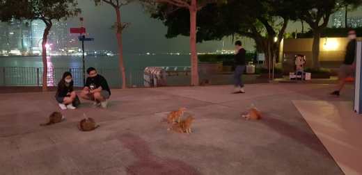 À l’heure où la nuit recouvre Hong Kong, les chats qui sommeillaient sur les rochers près du port remontent sur les quais.