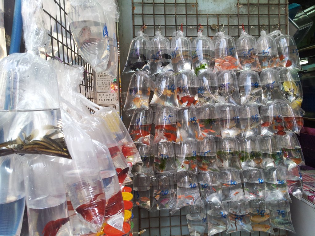 J’ai pris le métro, suis descendue à l’arrêt en question et là, dans la rue Tung Choi Street, s’étiraient sur le trottoir des dizaines et des dizaines de magasins vendant poissons, aquariums, granulés, sables, plantes, décorations, produits pour nettoyer… Bref, tout ce qui est nécessaire à l’aquariophile débutant ou averti.