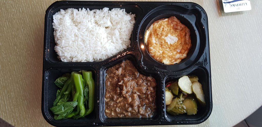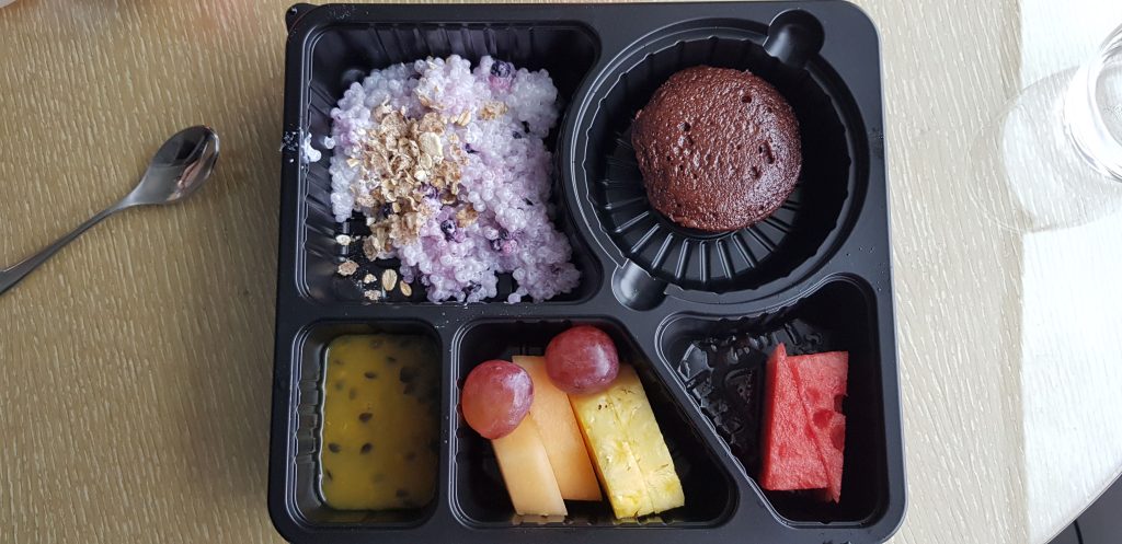 Jeudi dernier, avant notre départ, nous avions dû remplir un formulaire pour choisir ce que nous allions manger. Nous avions notamment toujours le choix entre un plat chinois végé ou avec viande, ou un plat « occidental » végé ou avec viande. Lorsque nous avons rempli le formulaire, j’avais trouvé relativement perturbant de devoir choisir en avance 14x 3 plats, soit 42 menus, en avance… Mais maintenant que le choix est fait, et que nous avons oublié ce que nous avions coché, c’est donc toujours la surprise.