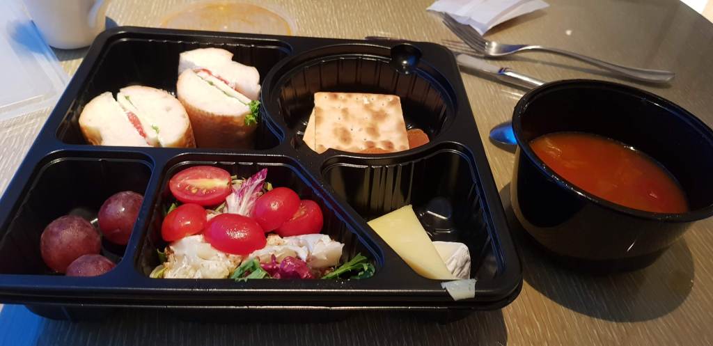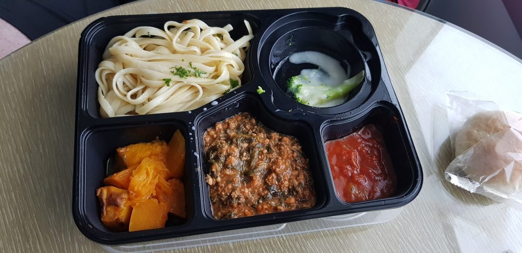 Le matin, entre 7h et 09h, quelqu’un nous apporte donc le petit déj… l’heure est hyper aléatoire. Parfois, c’est 7h15, parfois 8h30. Lorsque le plateau est posé, l’employé sonne… et court ensuite à l’autre bout du couloir. Nous mettons donc notre masque pour récupérer le paquet, déposé devant une chaise plastifiée posée devant notre porte. Idem entre midi et 14h… et entre 18h et 20h.