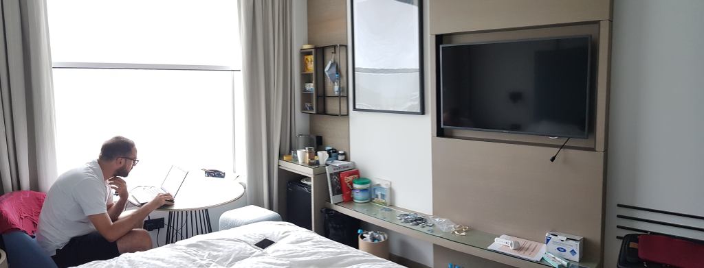 Après le petit déjeuner, nous faisons la vaisselle dans l’évier de la salle de bain, nous faisons le lit, « rangeons » et « aérons » la chambre… avec l’aide de la clim et d’huiles essentielles. Je ne sais pas si c’est très efficace mais psychologiquement, ça fait l’affaire. Puis on se met à travailler jusqu’à midi.