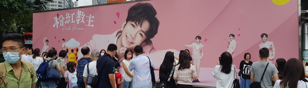 Dimanche, alors que nous rentrons à la maison, une foule surexcitée s’amasse devant un grand poster. Des gens – de tout âge… de tous styles… hommes, femmes, jeunes et moins jeunes, font la queue en plein cagnard pour se prendre en photos devant une image immense, rose bonbon, avec un jeune homme posant dessus à la manière des groupes de K-Pop qui sont si populaires.
