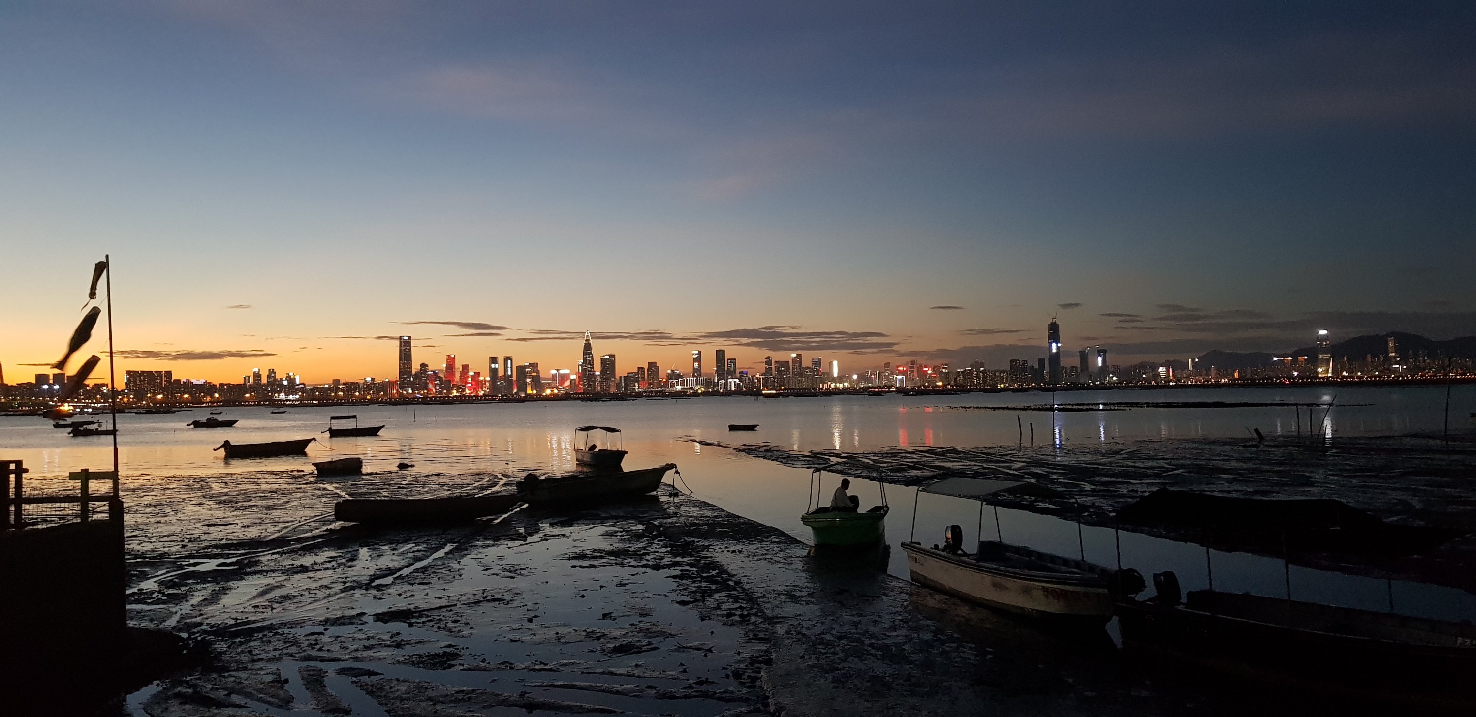 Le soir venu, nous nous dirigeons vers le village de pêcheurs de Lau Fau Shan. Nous arpentons ses ruelles sinueuses où l’on peut observer des dizaines d’échoppes de fruits de mer séchés et de poissonneries. Au bout du village, nous arrivons sur une jetée avec une vue époustouflante. Le soleil se couche sur Shenzhen et les lumières sont prodigieuses.