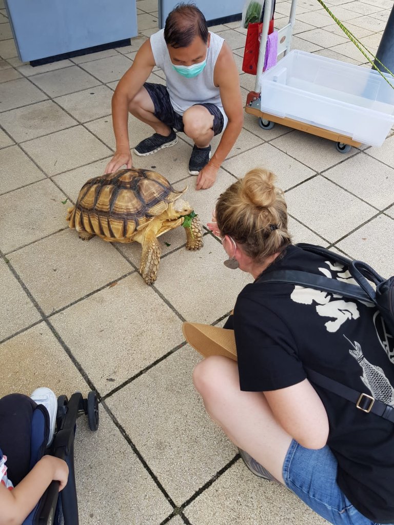 Après le repas, nous nous dirigeons vers le Tin Sau Bazaar. Pour s’y rendre, il faut traverser un parc et nous tombons nez à nez avec un homme promenant son énorme tortue. L’animal est superbe. Sa carapace a la forme d’une fleur et nous l’observons de longue minutes. On a même la chance de pouvoir lui donner à manger une pomme et des feuilles et je suis surprise de la taille de ses dents.