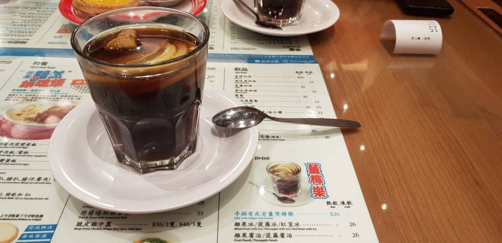 Une recette traditionnelle des caa caan teng de Hong Kong est le coca-cola chaud, dans lequel on met du gingembre et du citron. Quand j’ai vu cette boisson sur le menu, je n’ai pas hésité une seconde!