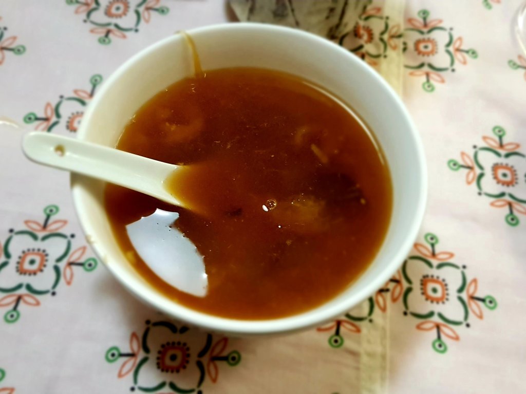 La soupe en elle-même est effectivement gélatineuse et très salée. Elle comprend cette imitation, effilée en petites lamelles, des champignons et divers légumes. C’est plutôt bon.