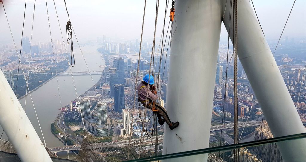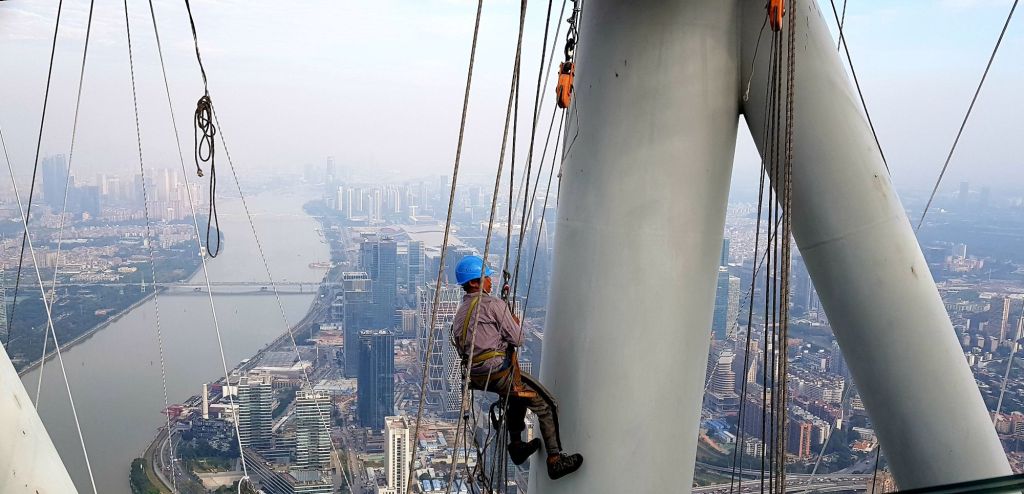 Un homme, assis sur l’un des plus haut pilier de la structure, répare quelque chose avec du matériel sommaire. J’ai des palpitations en le regardant. Il est accroché avec ses jambes, au dessus du sol, avec une petite balançoire en bois que j’aurais pu fabriquer moi-même. Il y a des héros du quotidien.