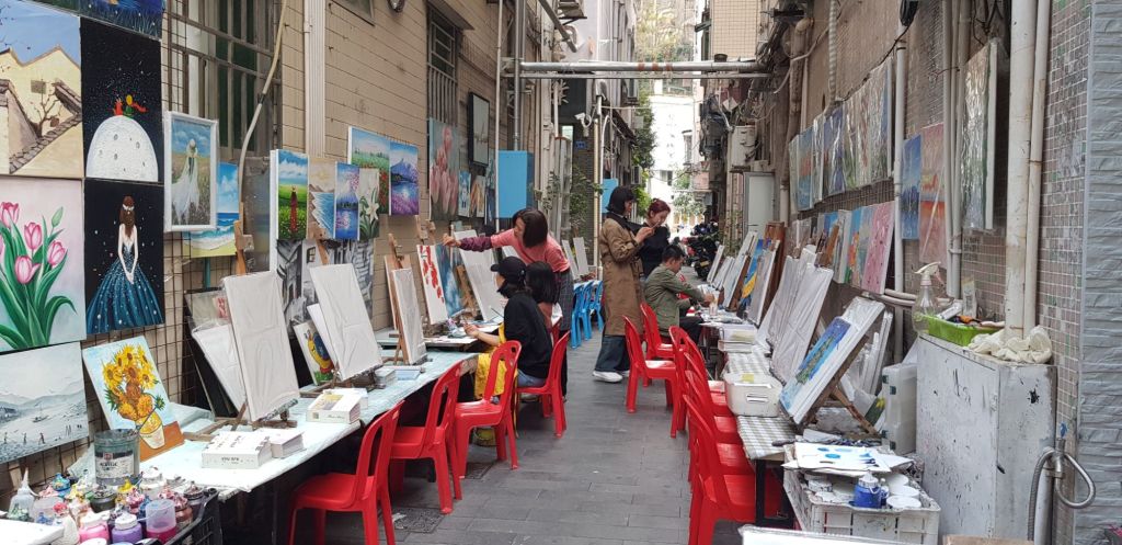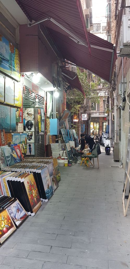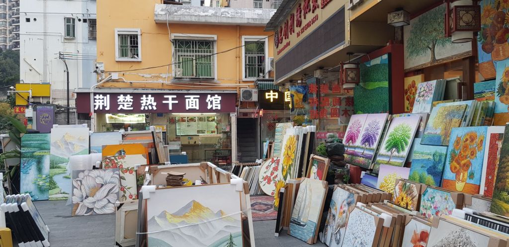En 2002, dixit mon ami Wikipedia, 150 ateliers emploiaient 8 000 peintres qui ont chacun leur spécialité (portraits, tableaux de Van Gogh, peinture traditionnelle chinoise, Léonard de Vinci, cubisme, etc.). 60% des copies à l’huile mondiale seraient d’ailleurs créés là.