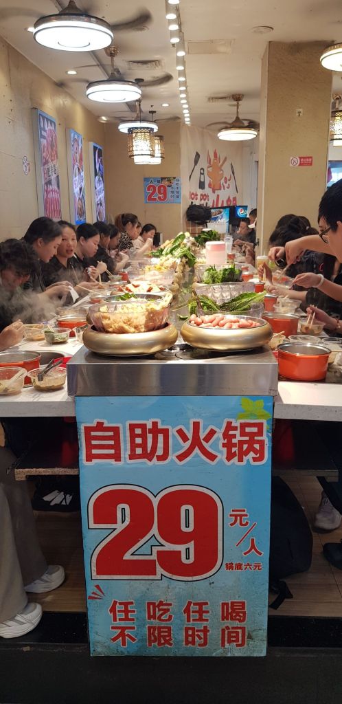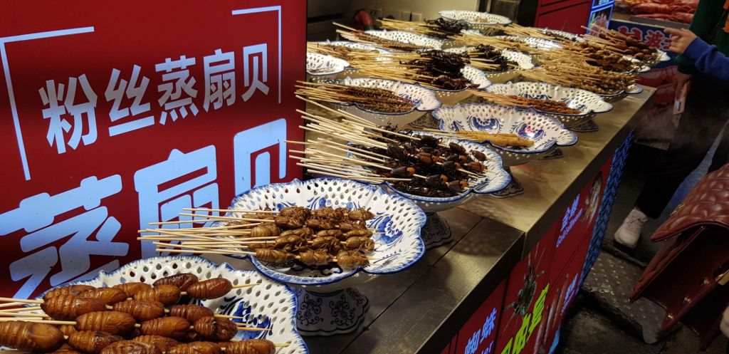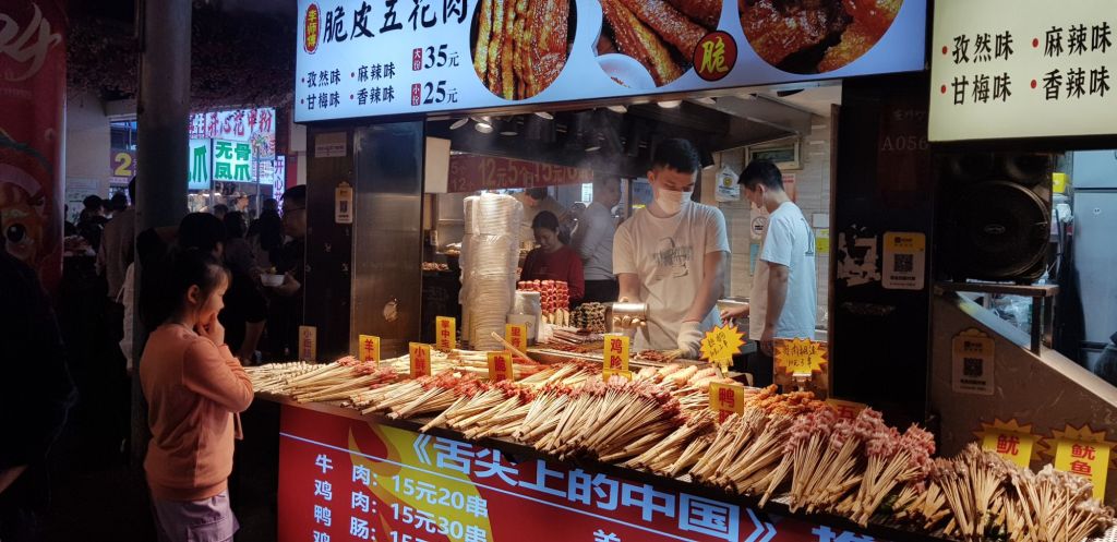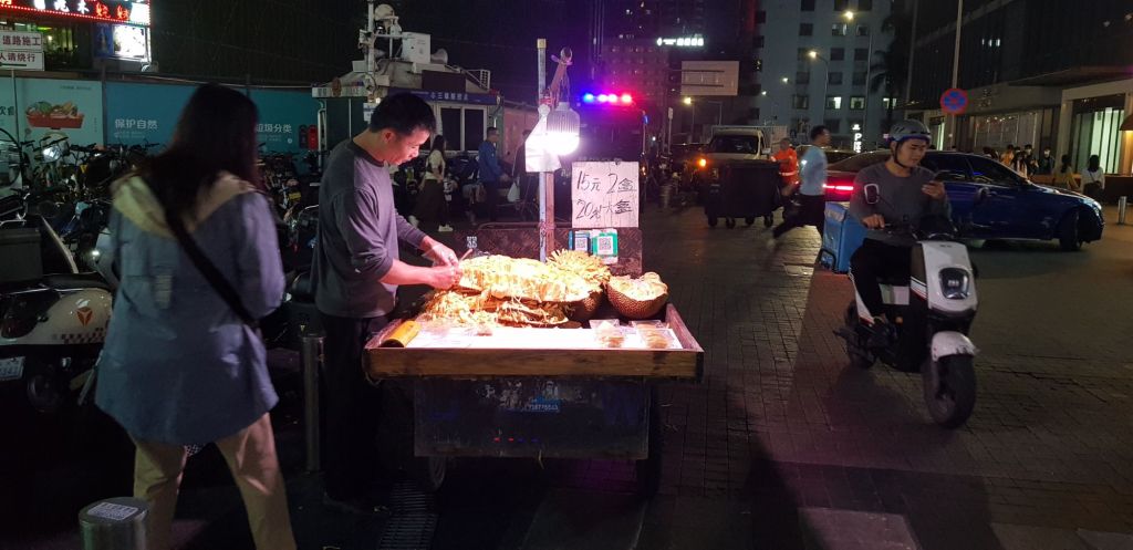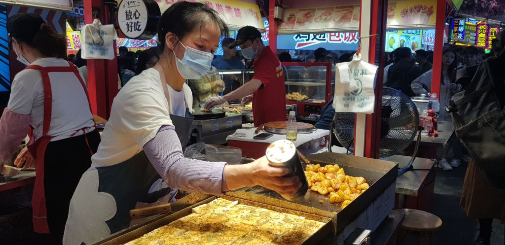 Nous continuons notre balade jusqu’à Dongmen, une zone piétonne spécialisée dans la streetfood. Des marchés immenses vendent toutes sortes de choses à manger : brochettes, pancakes aux oignons, fruits de mer, patates sautées, desserts colorés. Nous nous en donnons à cœur joie et goûtons de tout.