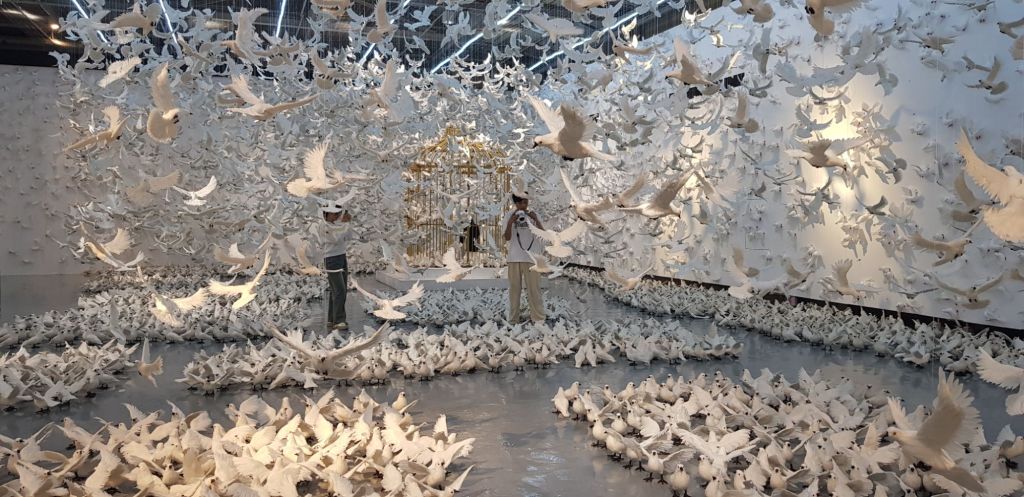 Nous admirons une exposition très étrange. J’en viens à me demander si les textes expliquant les oeuvres n’ont pas été écrits par Chat GPT avant d’être grossièrement traduits sur un outil de traduction automatique tant ça n’a ni queue ni tête – il est question d’anges et de cheval vert que nous sommes tous au fond de nous… ainsi que de pigeons qui représentent la vie (mais les œuvres étant… esthétiquement discutables également… ça se recoupe – et pourtant habituellement, j’aime beaucoup l’art contemporain).