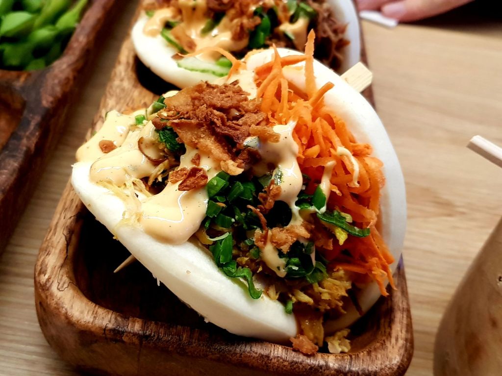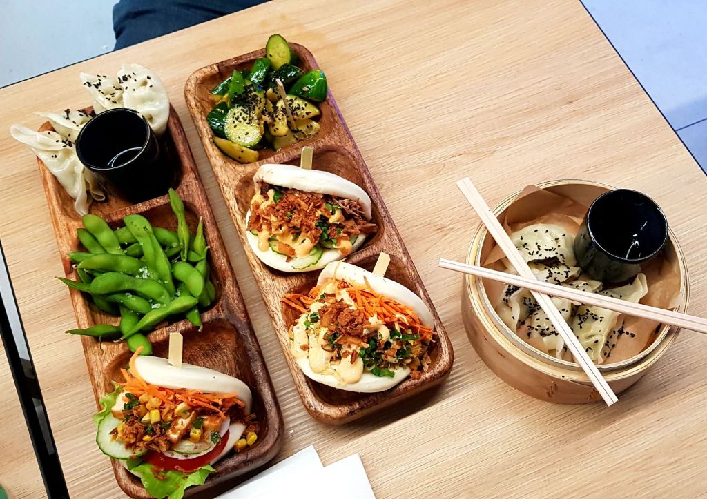 On commande deux sets pour goûter. Nous prenons un set avec un bao au porc et un au poulet + de la salade de Taïwan ainsi qu’un set avec un bao végétarien, des gyozas et des edamames.