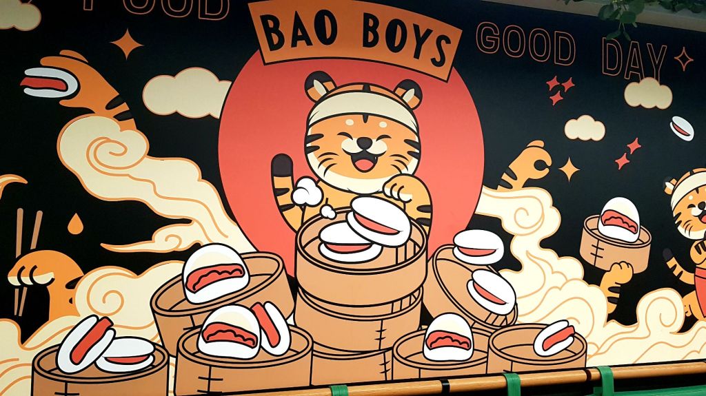 La décoration du resto est super jolie même si ça reste un endroit de restauration rapide. Des paniers vapeur sont suspendus au mur et une fresque avec un joli tigre colore les lieux.