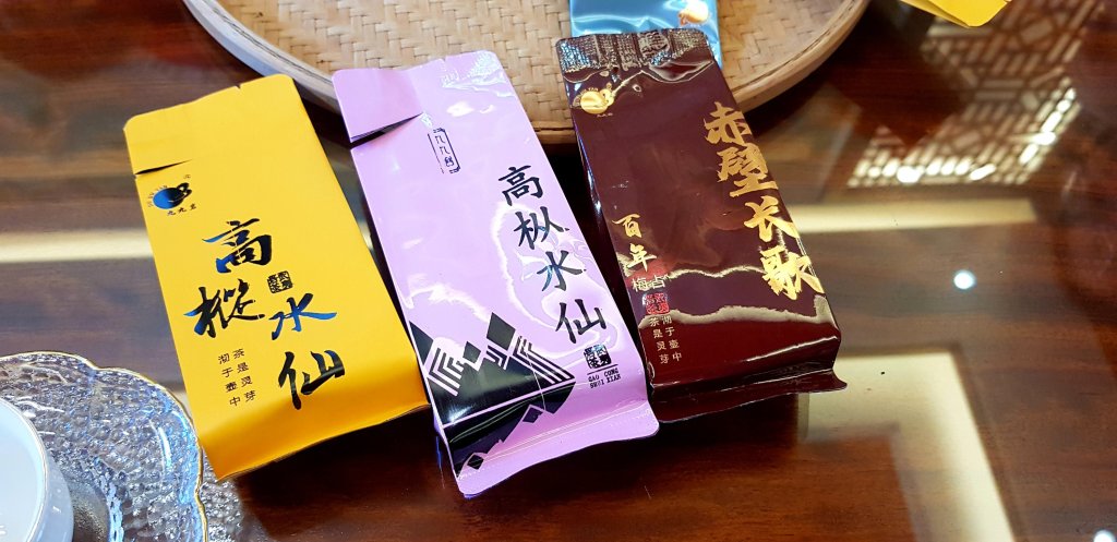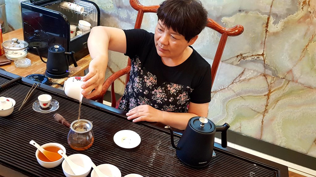 Heureusement, c’est l’heure de la dégustation de thé ! Parfait pour la digestion. Nous admirons alors les gestes parfaits de la tante de Suzan qui nous fait découvrir les divers crus de Oolong. Je vous listerai bien les noms des thés que nous avons goûtés mais ils sont tous en chinois et il y en a des dizaines. Certains sont des grands crus… et coûtent près de 50 CHF les 20 grammes.
