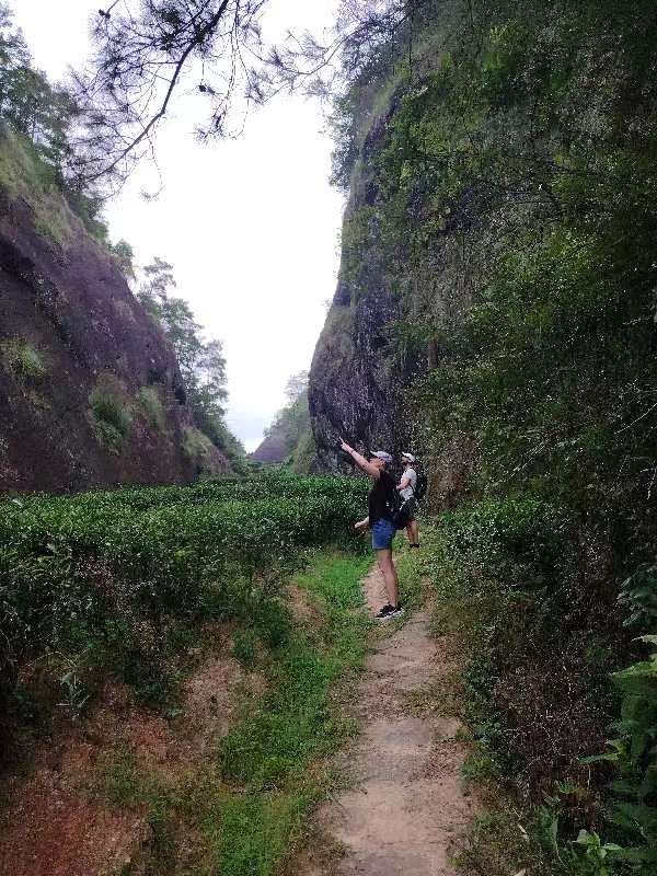 Nous entrons dans le parc par l’entrée Nord et nous nous dirigeons vers les buissons mères (les plus anciens, dont certains ont plusieurs milliers d’années). Jusque là, la foule est dense et je me dis que la balade sera animée, loin du calme espéré dans les montagnes. Mais les gens sont paresseux et une fois le plus vieux buisson aperçu, ils rebroussent chemin. Nous nous enfonçons dans les montagnes en direction du temple de Tianxin Yongle et là, nous sommes seuls au monde. C’est superbe et nous découvrons avec l’aide de Suzan les différences entre les plants de thé !