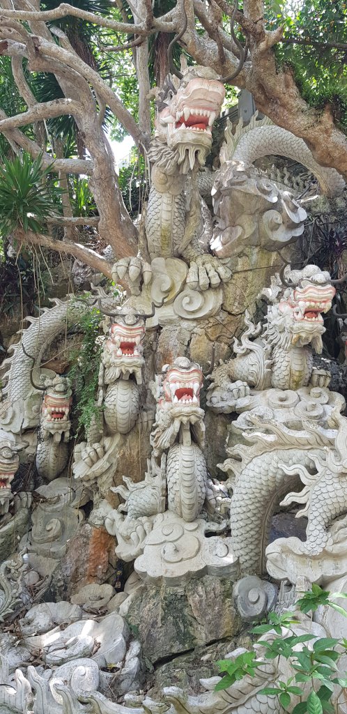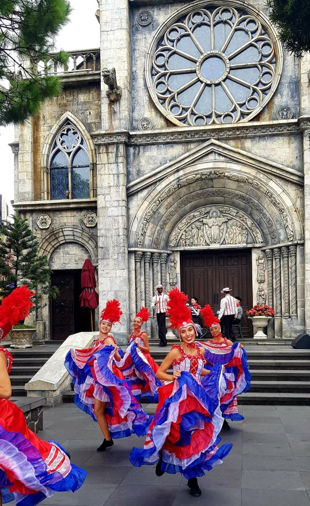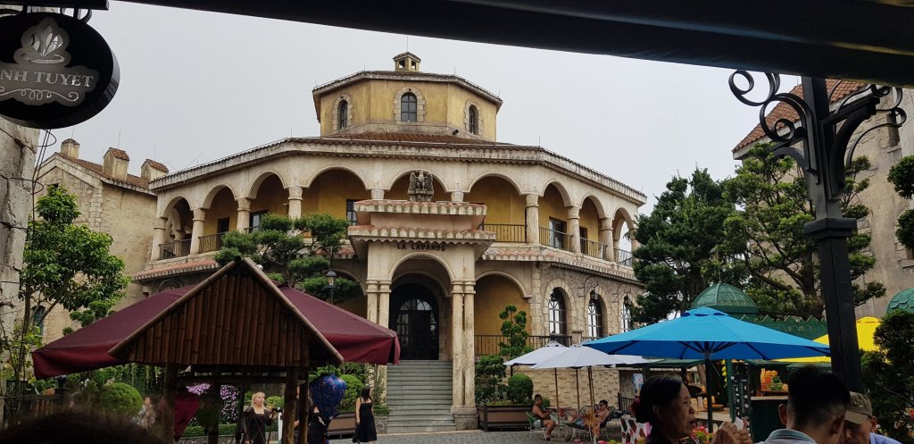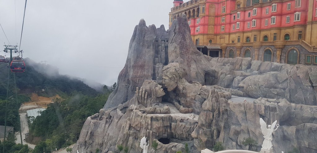 Lundi : en arrivant à Da Nang, j’avais été attirée par une photo d’un pont soutenu par deux mains géantes. Ca m’avait l’air sublime. Nous avons donc décidé d’en faire notre excursion du jour. Le lieu, appelé Ba Na Hill, était un ancien village de vacances créé en 1920 par les colons français. Se situant à 1400 mètres d’altitude, on y accède donc en télécabine. Jusque là, tout allait bien. Je m’attendais à visiter un vrai village historique. Mais en arrivant au sommet, la surprise a été de taille : un faux village soit disant français avait été recréé. Tout en plastique, les bâtiments cachaient une sorte de parc à thème mettant en scène une France fantasmée par les Vietnamiens. Au final, tout était faux et complètement à côté de la plaque. On se serait cru dans un village d’Europa-Park servant Bretzel et saucisses allemandes et diffusant du Florent Pagny à plein régime via des hauts parleurs… j’ai oscillé entre l’amusement le plus total et la stupeur complète face à ce drôle d’endroit. Quant au pont, il a été construit en 2018 pour les touristes (à côté du jardin de l’Amouuuuur !).