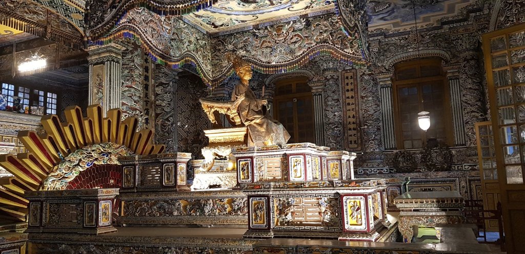 Après la cité impériale, nous sommes partis à la conquête du temple de Dai Hung, connu pour abriter la voiture d’un moine s’étant immolé en 1963 pour protester contre les Américains. Et nous finissons la journée par la visite du mausolée de l’Empereur Khai Dinh. L’endroit est flamboyant. On se croirait à Versailles. J’ai du mal à croire qu’il a été bâti entre 1920 et 1930 tant son archipel fait penser à un temps révolu.